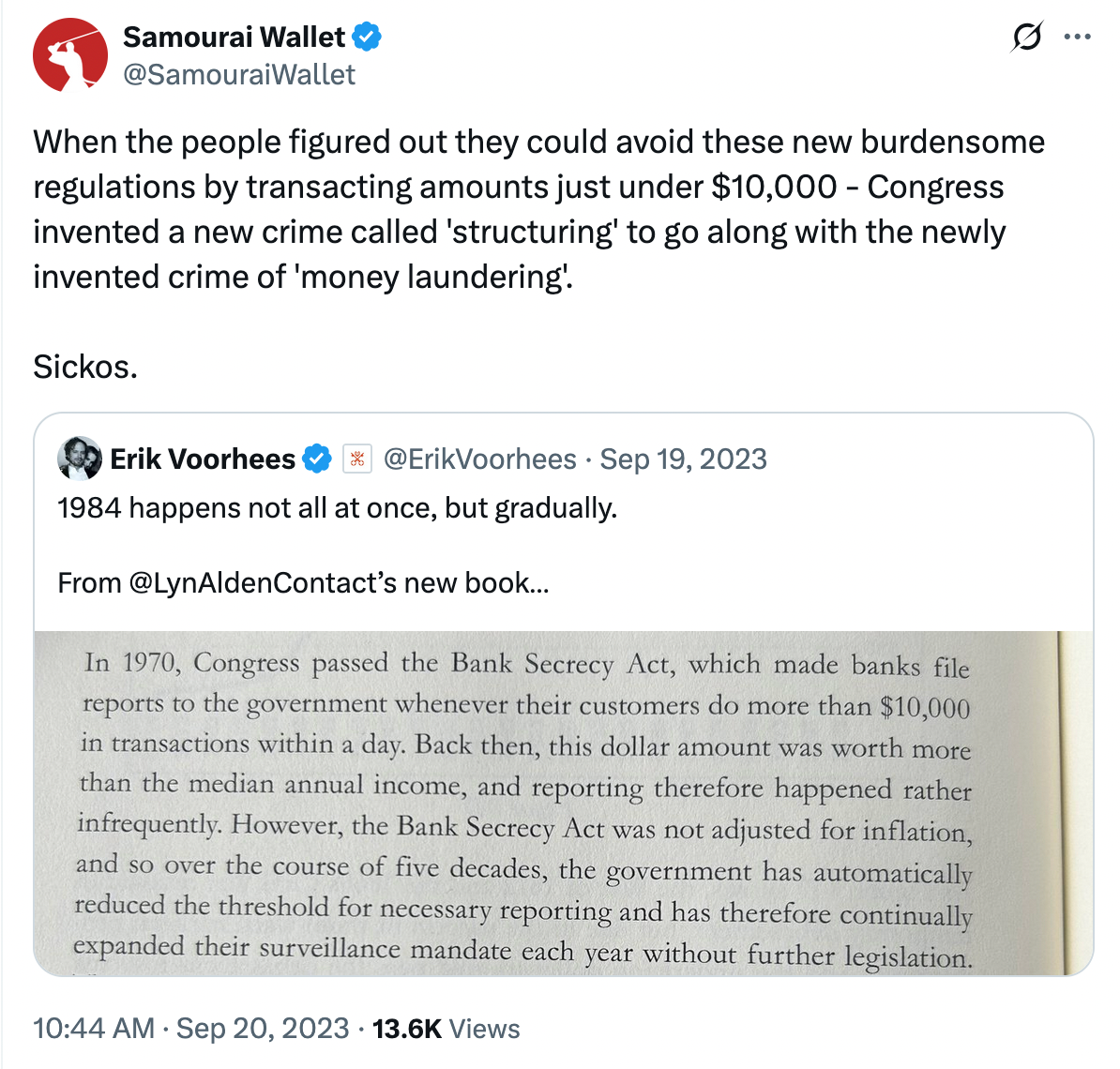 The original post quotes ShapeShift founder Erik Voorhees, who criticizes Bank Secrecy Act reporting requirements for widespread surveillance illustrated by an excerpt of Ego Death Capital General Partner Lyn Alden's book Broken Money, in which the author lays out that currency transaction reports have never been adjusted for inflation, and therefore span a much wider surveillance net than arguably intended in the 1970s.