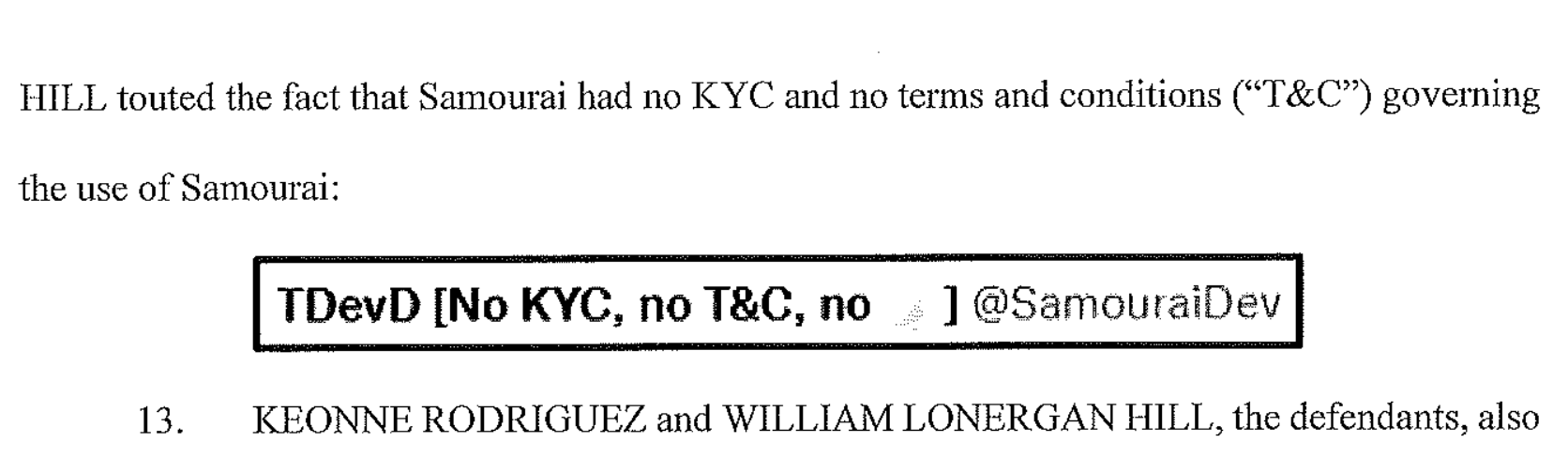 The new indictment continues to highlight that the developers "specifically promoted Samourai for its ability to allow customers to engage in anonymous transactions," citing Hill's X (formerly Twitter) user name: "TDev [No KYC, no T&C]".