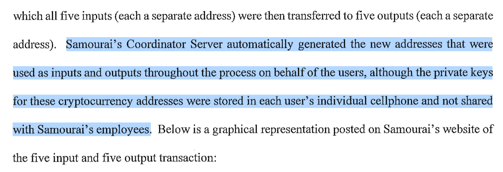 To compare, the original indictment stated that "the cryptocurrency is 'cut down'", and that leftover funds "are placed in a separate address and provided back to the Samourai user." While not explicitly stating that these events are caused by the Samourai Wallet software – and not the developers – it appears to be a more accurate description of the service than can be found in the new indictment.